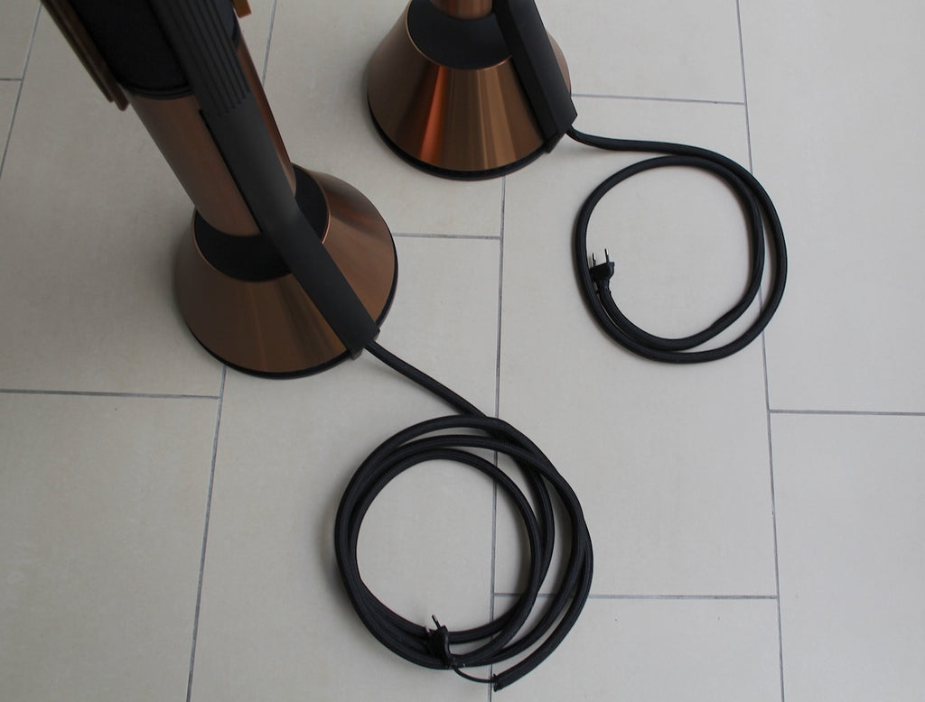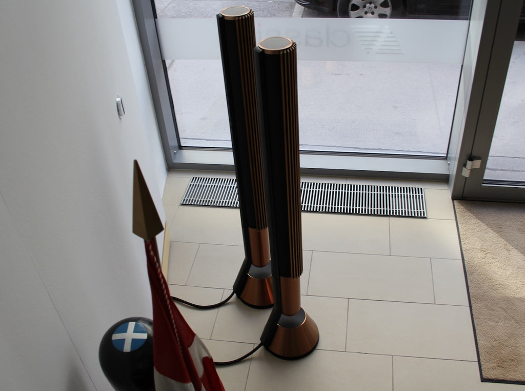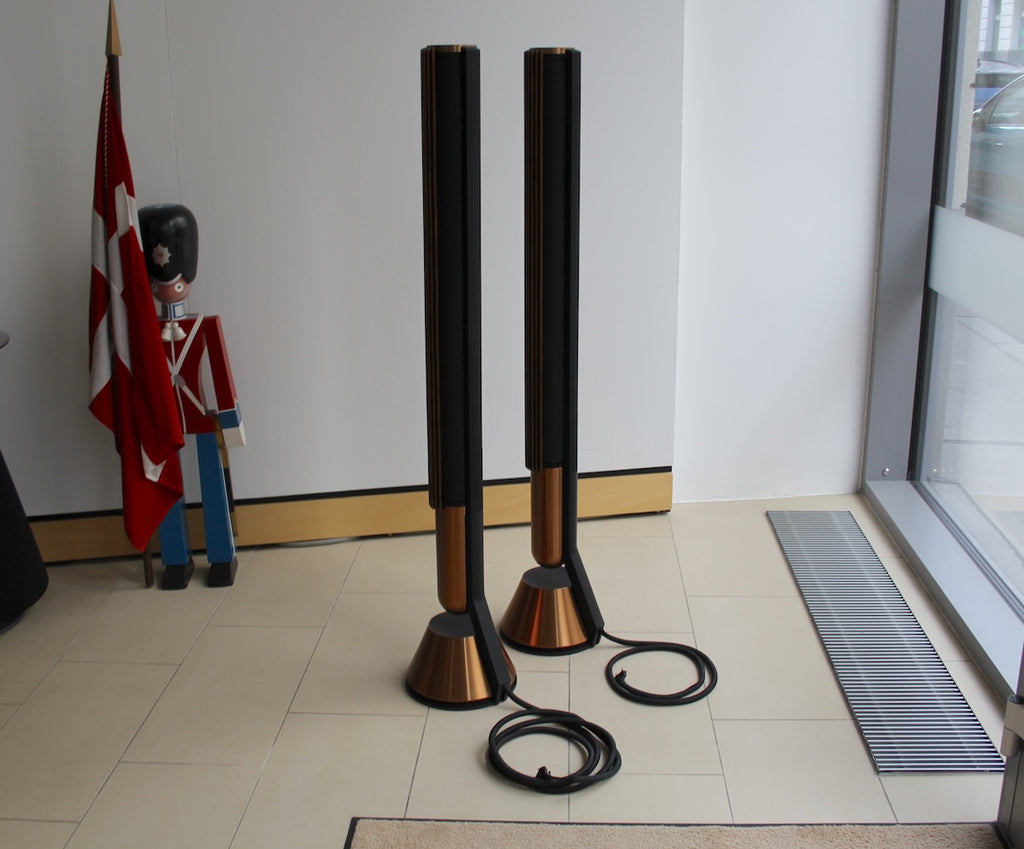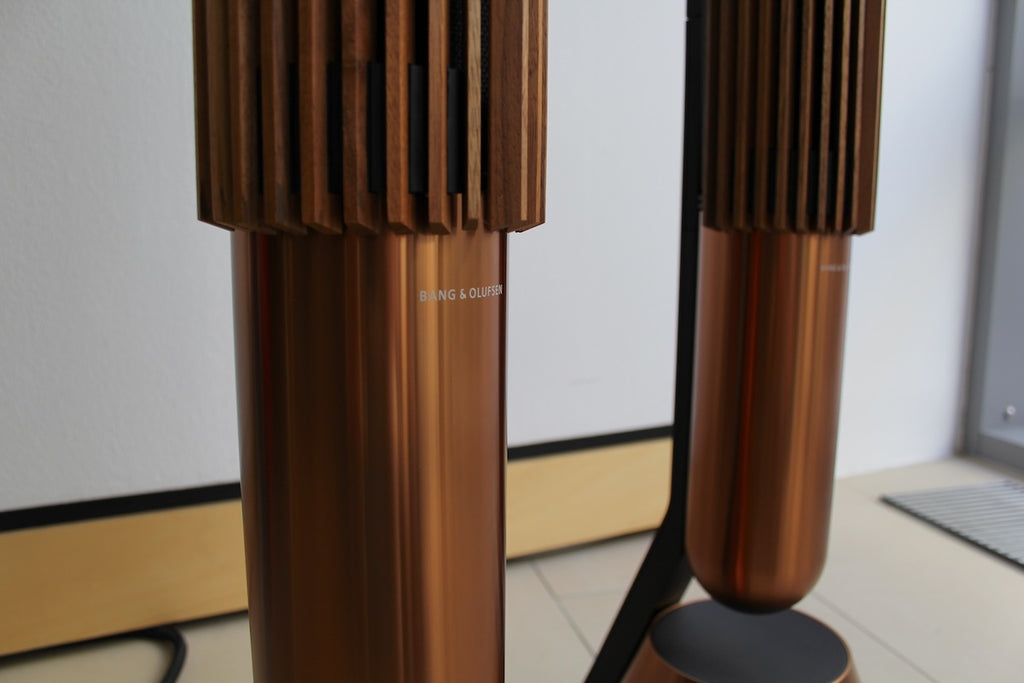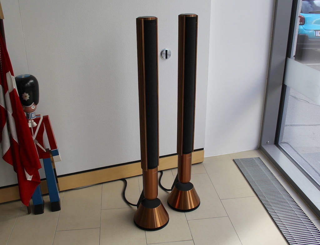 Ein Paar BeoLab 28 Lautsprecher im makellosen Zustand, Werksauslieferung September 2022. Ausführung in der Sonderfarbe bronze tone mit Frontlamellen in Walnuss.