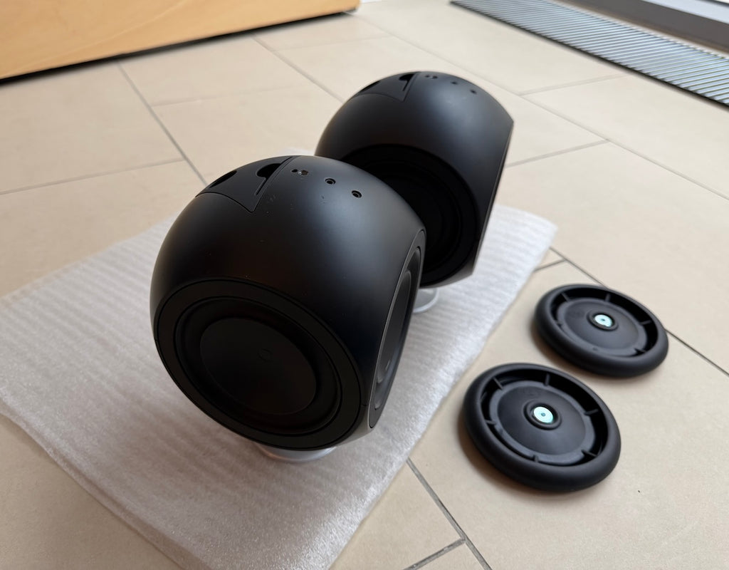 Ein Paar BeoLab 3 in schwarz, mit kleinen Gebrauchsspuren an der Unterseite, sonst im gepflegten Zustand. Lieferung mit Anschlusskabeln und 6 Monaten Garantie. Listenpreis €3690