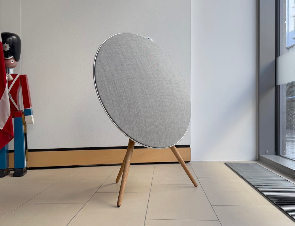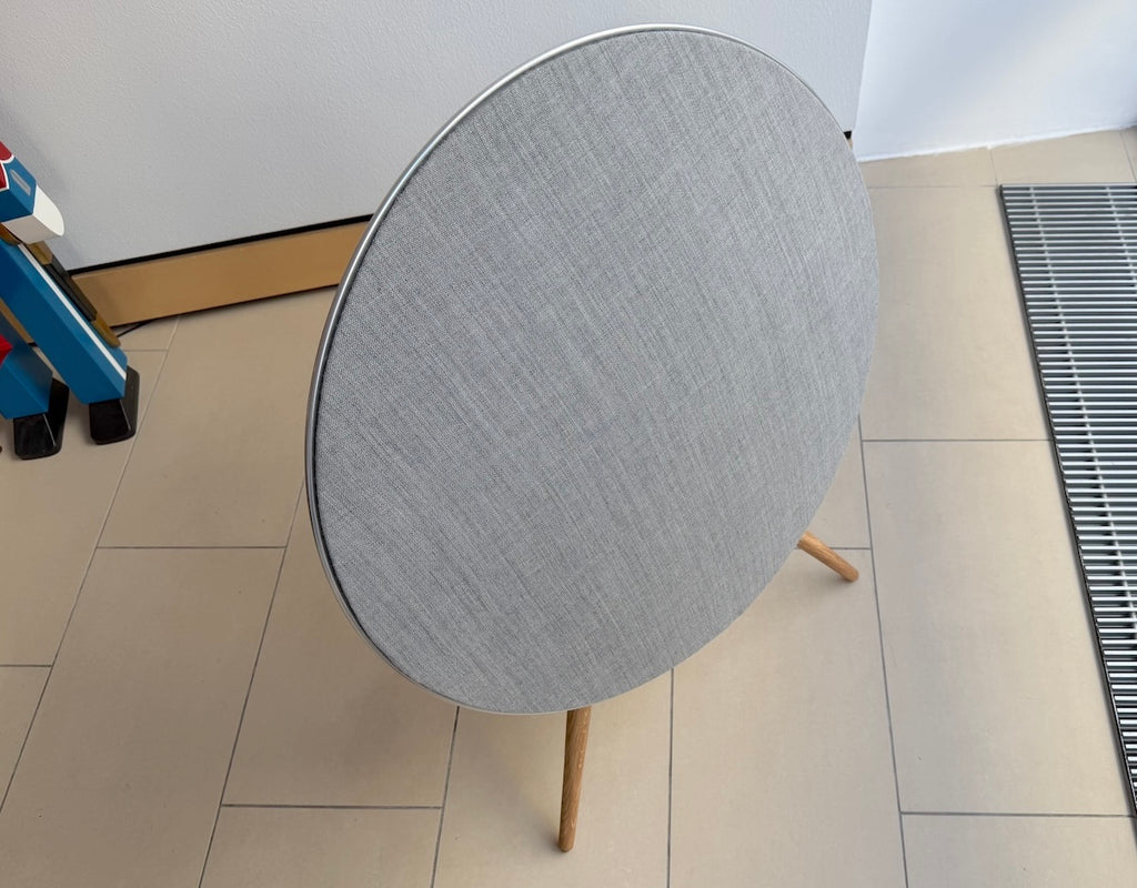 BANG&OLUFSEN BeoSound A9 in der aktuellen fünften Version in der "natural"-Ausführung, d.h. Rückseite in "grey mist", Ring Aluminium natur poliert, Frontblende "light grey" von Kvadrat und Füsse in Eiche.