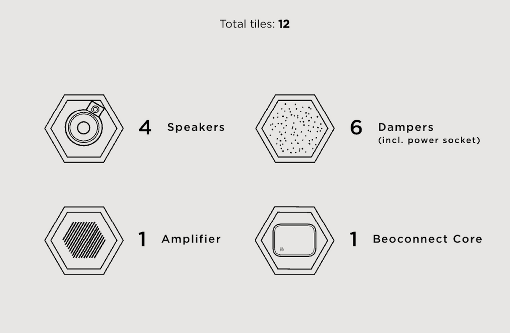 12-teiliges Beosound Shape System mit 4 Speakers, 6 Dampers, einem Amplifier und wahlweise mit/ohne BeoSound / BeoConnect Core.